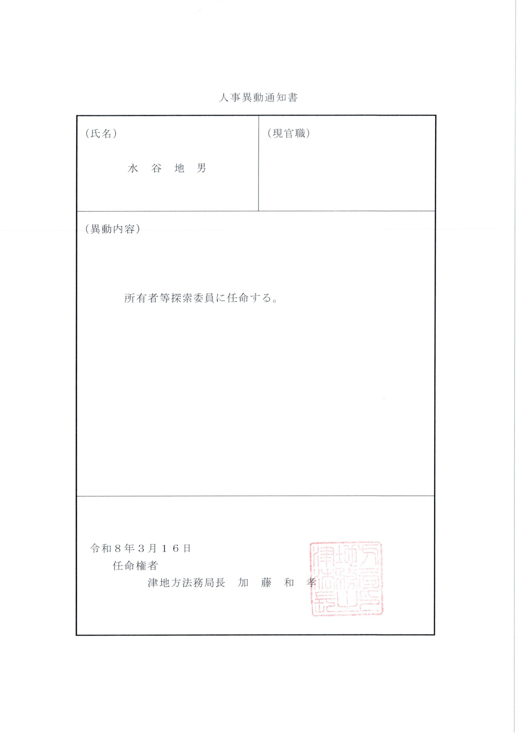 令和8年3月16日、津地方法務局の「所有者等探索委員」に任命されました。